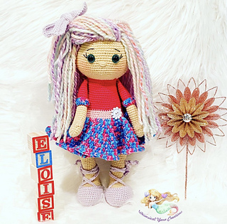 Eloise is 14.5 in/34 cm tall when using a 4 mm hook and yarn under. Eloise uses basic stitches- single, half double and double crochet. It also requires the skill of the magic ring, increase and decrease. A special stitch that is used in this doll is the bobble stitch.
