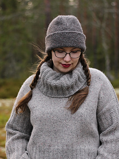Tukuwool Nordic Resilk (50 % recycled silk, 50 % Finnish wool, 135 m / 50 g) or other sport to DK weight yarn.