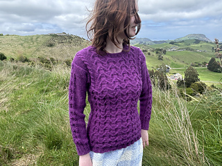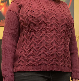 Choose a size that provides approximately 5-6” of positive ease in the chest. The texture of the cables shows up best in a solid or mostly solid colorway.