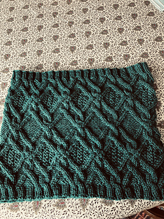Body of Cowl using larger needles in cable pattern unstretched: 16sts x 27 rows = 2.25in x 4in/5.5cm x 10cm