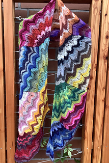 Fans of chevrons fit together neatly in this colorful creative shawl and scarf pattern. The fan shapes are worked in intarsia with two colors per row. Mixing yarns of differing weights creates various degrees of transparency and drape.
