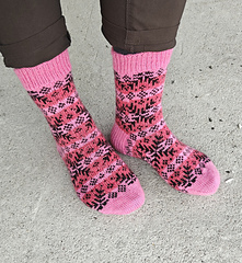 These socks are worked in the round from the cuff down with a heel flap. The stranded colorwork uses three colors with a motif inspired by nature arranged onto a striping background.
