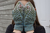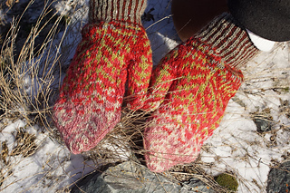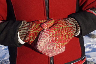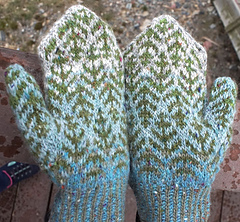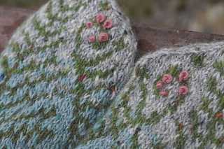 These mittens are worked in the round from the bottom up following a colourwork chart. After a decorative cast on and a small corrugated ribbing section, the chart integrates a thumb gusset, with thumb stitches put on a holder before finishing the rest of the body. The large pattern is mirrored on the back of left and right mittens, with a smaller leafy motif on the palm. Modified French knots may be added at the end as an embellishment.