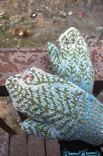 Large curling ferns are mirrored on these mitts, with a simple leafy pattern on the reverse.