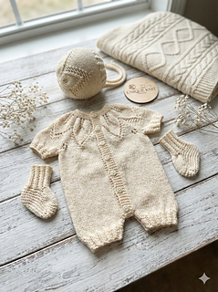 The romper is knitted from the top down with a beautiful leaf design around the neckline. The cuffs are knitted with a simple twist stitch that does not require any cable needles.
