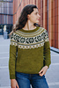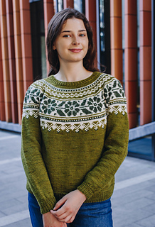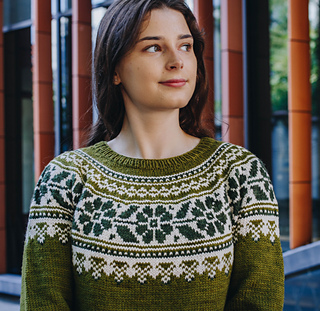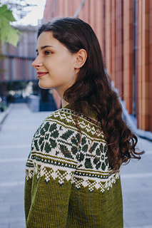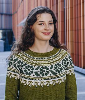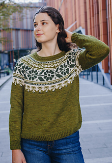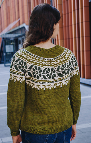 Fioria is a top down seamless yoke sweater with a deep colorwork chart that has been influenced by historical Polish embroidery. The motif is from a cross stitched ladies’ shirt from central Poland in Rawa Mazowiecki. The neckline is ribbed and is followed by short rows at the back of the neck to create a comfortable fit. This is followed by stranded knitting that is worked in multiple colours, featuring flowers, leaves and geometrical shapes. The chart continues past the arm and body divide for the smaller sizes. The sleeves are knit in stockinette stitch and the cuffs and body are finished off in ribbing. The body has optional waistline shaping for a flattering fit.