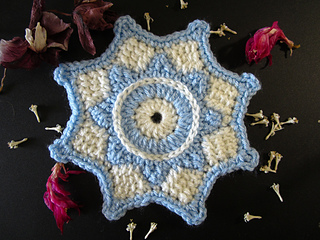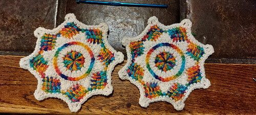 Diameter of the mug rugs is about 5.5 inches (14 cm), and they are shaped as a flower doily.
