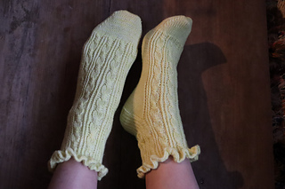 “Fondant” socks are, as the name suggests, inspired by fondant, a smooth sugar paste used for decorating cakes and pastries. These are cable rib socks with a creamy, fondant-like texture. They are adorned with frills, creating a design as elegant as a beautifully decorated cake.