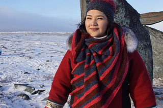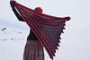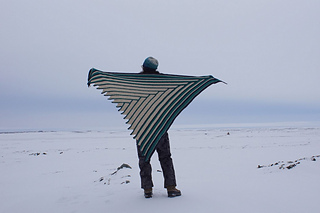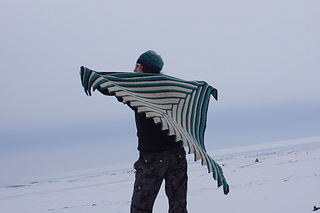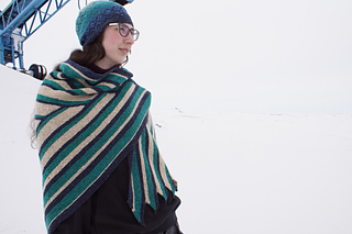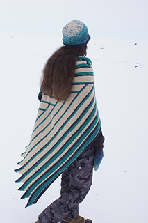 This modular shawl grows in slanting log-cabin sections, with changing stripes depicting the instability of melting ice in spring or melting rock in lava.
