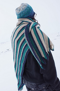 This shawl is knit in sections of increasing size, in log-cabin sections on a slant. Work starts with a small rhombus, and sections are added on one side, then the other. Using two circular needles makes it easy to go back and forth between sections. Stripes of changing sizes create an illusion of movement and perspective.