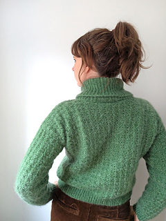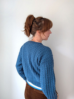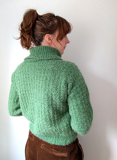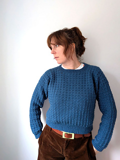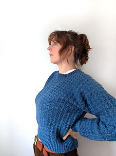 The blue version uses WYS Colour Lab DK. Which is a slightly heavier yarn weight than the pattern calls for so when meeting gauge, it creates a firmer fabric, which is less drapey than the fluffy sweater. It will be warm in winter!
