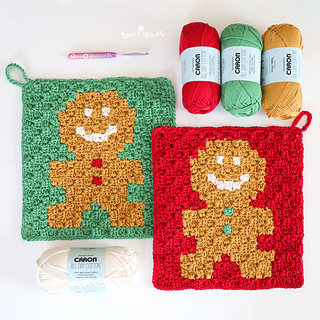 Amount of yarn needed for one dishcloth: 33g of golden brown, 55g of red for background, 3g of green for buttons, and about 6g of cream for eyes/smile.