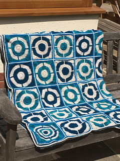 Easy beginner pattern with striking results. Simple bullseye circles with a twist - one single post stitch makes all the difference. A careful and minimalist join brings out the corner design, making for a modern and eye-catching throw.