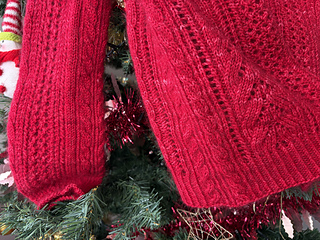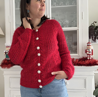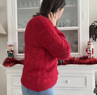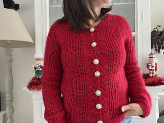 It’s a raglan cardigan worked top-down, back and forth, alternating lace stitches on the body and sleeves. The raglans are embellished with twisted stitches and cables.