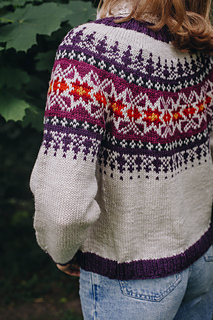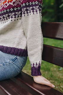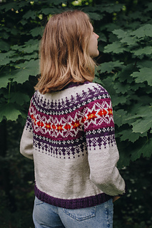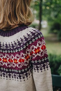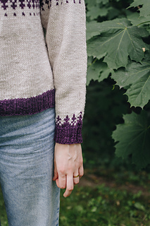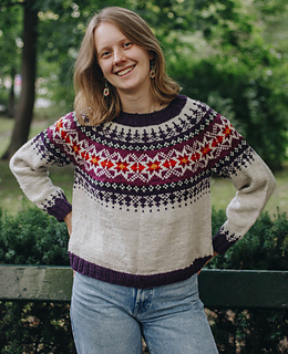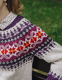 Gwiazda, which means star in Polish, is a top down seamless yoke sweater with a deep colorwork chart that uses stars and diamonds to create a striking yoke. The neckline features double ribbing with integrated increases and is followed by short rows at the back of the neck to create a comfortable fit. This is followed by stranded knitting that is worked in multiple colours. The chart continues past the arm and body divide for almost all of the sizes. The sleeves are knit in stockinette stitch and the cuffs and body are finished off in double ribbing. The body has optional waistline shaping for a flattering fit.