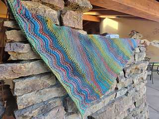 Stripes of garter stitch and rows of eyelet stitch patterns alternate with a section of triangles worked with a short row knitting technique and sections of a wavy lace stitch pattern.