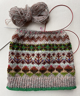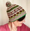 Fair Isle motivs with a modern twist due to colour choice and combination and a double knitted head band, that secures a nice lasting fit are the features of this pattern.