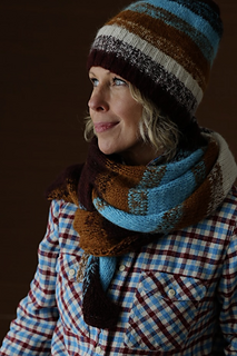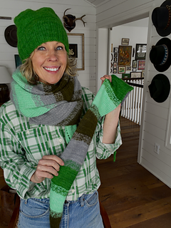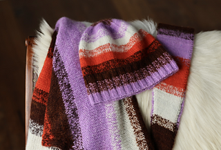 Say ‘hello’ to Hazy Shades! Bold color block stripes with hazy marled edges feature in this fantastic three-piece set (wrap, hat, and scarf). It’s a cozy and playful trifecta to warm you right up!