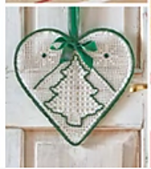 Outer heart shape, inside there is a Christmas tree in white with green outline. Hung with ribbon bow.