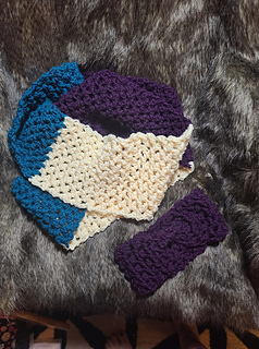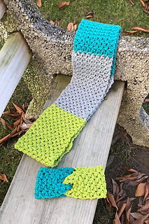 The pattern can be worked holding 2 strands of a very light worsted weight yarn together (I used Mighty Stitch which is very close to a DK weight yarn). Or you can use a heavy worsted weight yarn to make the set. Then have fun with the colors and scramble them up as I did (details on color changes in the pattern) or make it a solid color or use a self striping or ombre yarn, the possibilities are endless for different looks with this pattern.