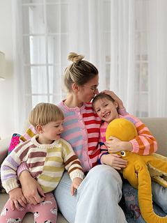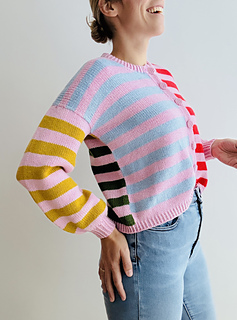 The cardigan is worked top down in one piece: First, the back part is worked back and forth in rows in stockinette stitch and with statement stripes in 2 different contrast colours. There are a bunch of increases to shape the armholes, then the back part is finished off without any increases and the hem is worked in 1x1 twisted ribbing. The front is worked afterwards. For the right front part, pick up stitches along the back part, work in stockinette stitch and in statement stripes with increases to shape the round neck and the armholes. Then, finish the right front part in stockinette stitch and in statement stripes without any increases – but before working the hem, put the stitches on hold on another rope/leftover yarn. Then, work the left front part the same way you have worked the right front part before with the only difference, that the statement stripes are placed offset from each other and that the increases for the round neck and the armholes are mirrored. As soon as you have worked the last statement stripe, pick up the stitches of the right front part as well as the back part. Now work the hem for the left and the right front part and the back part in the main colour in 1x1 ribbing with twisted stitches. Close the side seams of the cardigan with the mattress stitch.Then, pick up stitches along the armholes and work the sleeves in two different contrast colours in stockinette stitch in the round.Before working the cuffs in 1x1 ribbing with twisted stitches, work in a bunch of decreases for a balloon like shape. Last, but not least, the double folded collar in 1x1 ribbing with twisted stitches is added to the round neck and the button band (and if you like the knitted buttons) is worked to finish off the unique look of the cardigan. The fit of the design is oversized and boxy. The sleeves are relatively wide and the length of the cardigan is relatively short. The eye-catching statement stripes pattern creates a cool look leaving room for many creative ways to interpret the design.It’s very easy to modify the cardigan to turn it into a sweater. The instructions how to modify the cardigan pattern to turn it into a sweater are included in the pattern (grey-green instructions).