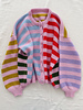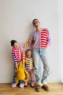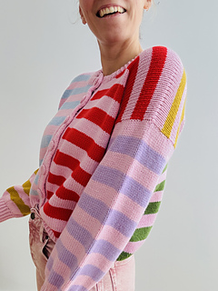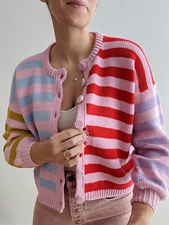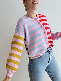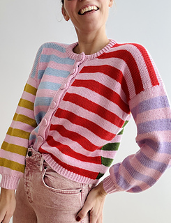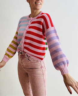 Knitting Pattern for a Loose Cardigan with a Mix of Colourful and Contrasting Stripes, a Boxy Fit and Wide Sleeves, A Classic Round Neck and a Double Knitted Button Band in Sizes XS | S | M (L |XL | 2XL) 3XL | 4XL | 5XL.