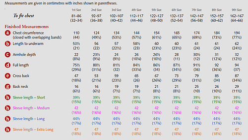 The pattern includes nine sizes to fit from 76-167 cm (30-66 inch) chest and includes comprehensive written instructions, sizing chart and schematic. The sample shown is the second size to fit 86-92 cm (34-36 in) chest.
