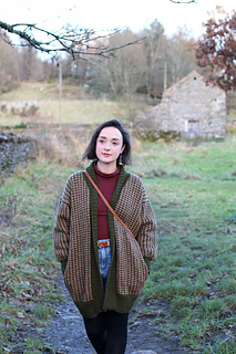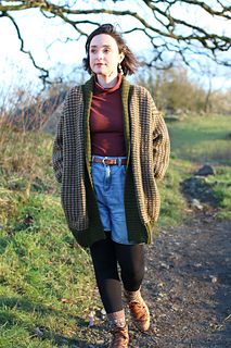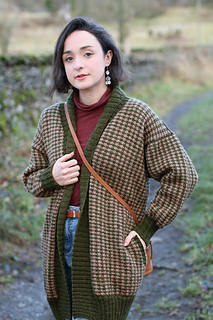 Hutton is a cozy, comforting, slightly over-sized cardigan, with a deep ribbed collar and edging and inset pockets. Perfect for autumnal walks or winter nights huddled around the fire!