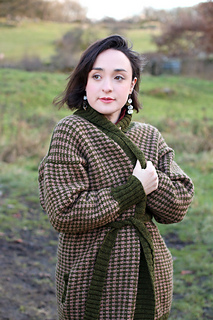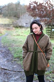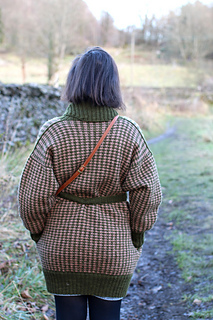 Hutton is knitted in a plump DK weight yarn using a simple two-colour slip stitch pattern. Only one colour is worked on any one row but an all-over two-colour pattern results. The cardigan is knitted from the bottom up commencing with a deep 2x2 ribbed welt. The lower body is unshaped but is split at the sides to insert deep inset pockets for maximum snuggle. The body is divided at the underarm and fronts and back worked separately until they are joined at the shoulders using a visible three-needle cast off. Sleeves are picked up around the armhole and worked downwards to achieve the perfect length; four lengths of sleeve are provided, short, medium, long and extra-long. The stitches for the collar and deep front bands are picked up and then the collar and bands are knitted in one piece with short rows worked to create a deeper shaped collar. A separate knitted belt is worked to tie around the waist.