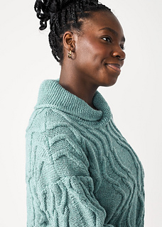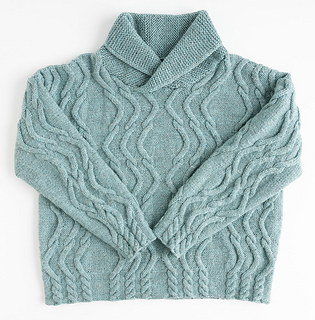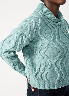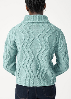 Sinewy stitches swing and sway to create a rippling, ribbed pullover! Worked in wavy cables, the sporty silhouette boasts a relaxed fit with simple dropped shoulder shaping. Options include a rounded shawl collar and a hemmed crewneck.