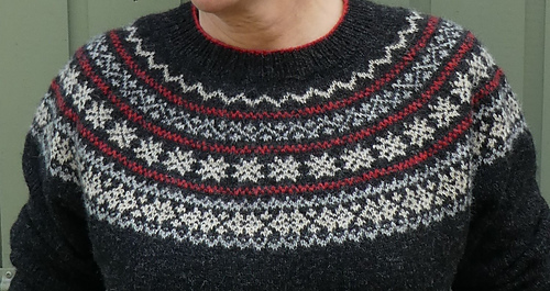The colours in this sweater echo those found in traditional Finnish knitted items. These were often knitted using natural blacks and greys, with sparing use of red yarn, which was the most hard to come by and expensive. This yoked sweater is knitted from the top down using 100% Shetland wool, and German short rows have been used to raise the back neckline.