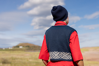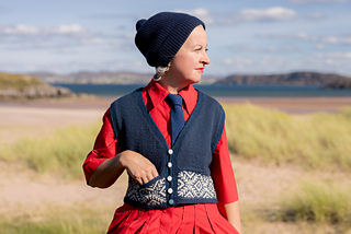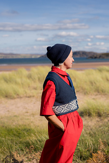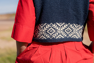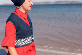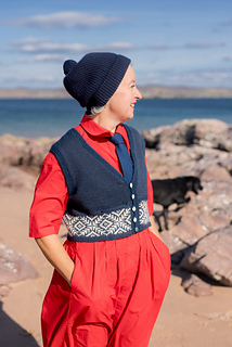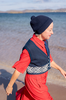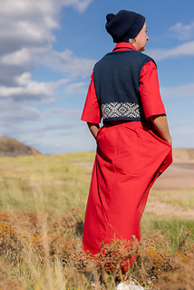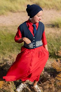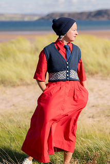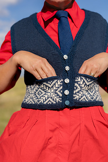 This waistcoat (or vest) begins by knitting two pocket linings. The body is then cast on and joined for working in the round, with a steek; and a colourwork band is worked, before joining the two pocket linings to the top of the band, and binding off the front steek stitches to continue working the remainder of the garment back and forth. Armscyes are shaped, then fronts and back are divided to be worked separately, shaping the front neck with decreases. The shoulders are joined and a garter stitch band is picked up around the front openings, neck, and armscye. The pockets are stitched in place and i-cord completes the pocket tops. After casting on, steek stitches are not included in running stitch counts.