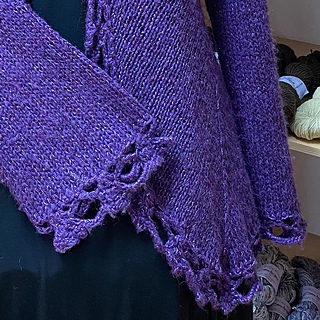 WinterVeilchen is an elegant cardigan knitted from the top to the bottom in stockinette stitch and finished with a crochet edging. The shoulders are closed by crocheting the edging – no sewing or grafting required.