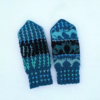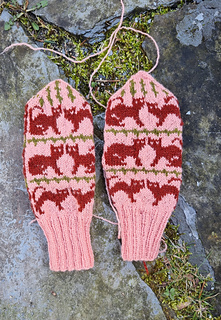 Don’t be fooled by the cat! Mittens with cats knitted in 2-ply yarn. The mittens are in two sizes. The gauge decides the size. Choose yarn and needles that gives you the right gauge to get the measurements in the pattern. If you want smaller mittens, you can use thinner needles. If you want larger mittens, you can choose thicker needles.