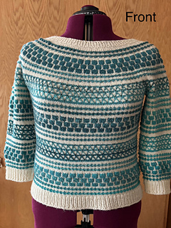 The same slip stitch patterning as the cowl makes the colorwork easy -- you only ever use one yarn in a round, so there’s no stranding. Short row shaping at the neck gives a comfortable fit, and slightly blousey long sleeves give it some modern flair.