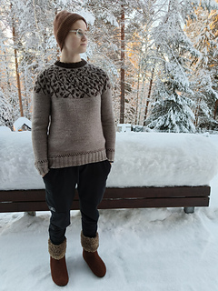 Kulkuri is warm sweater worked top-down seamlessly. The sweater features a colourwork yoke depicting twigs and berries. The sweater starts off with double-folded ribbing on the neckline worked with the contrast colour, and there are small colourwork accents before the sleeve and hem ribbings as well. The sweater has short rows to bring up the back of the neck, and the pattern features optional bust darts. The body is straight and there are three options for sleeve length included.