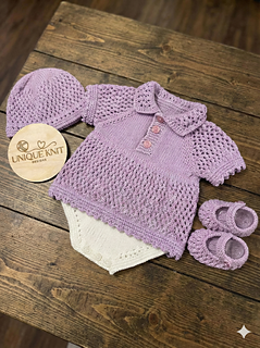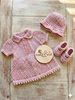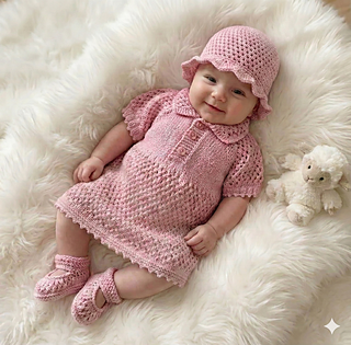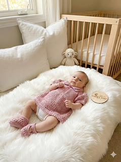 This beautiful all in one dress set is knitted from the top down on single-pointed needles. It has clear line by line instructions. The simple memorable stitch pattern makes this set easy to knit.