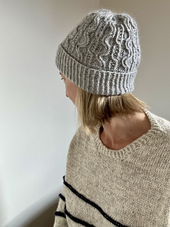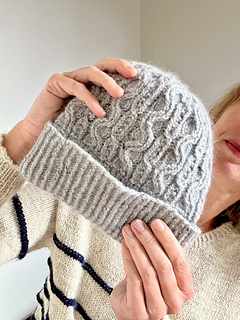 Layon is worked in the round from the bottom up and features cable motifs and twisted ribbing. The crown decreases are hidden within the pattern. The interplay of textures and the short repeats make this a very addictive project.