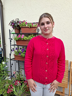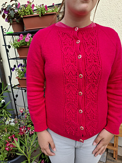 Top-down raglan construction, lace knitting, buttonholes, basic shaping.