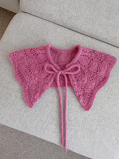 The collar is the focal point of the knit: a small yet striking detail that brightens an outfit and adds the finishing touch even to the simplest top. Its gently draping surface and refined texture make it both timeless and distinctive. The collar is knitted from fingering weight yarn held together with silk mohair, giving the knit an airy quality, a soft glow, and a luxurious feel against the skin. The result is effortless yet considered: a collar that elevates the entire outfit without drawing too much attention. The collar is worked flat from the top down and finished with i-cord ties.