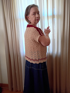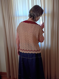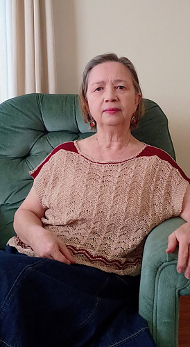 This garment has very simple “boxy” silhouette, dropped shoulders, shaped with short rows and lovely (almost) all over Lace Chevron stitch pattern.