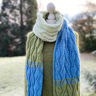 Dies ist eine Anleitung für einen kuschelig, leichten Winterschal, der auf der Vorderseite ein schönes Lacemuster zeigt und auf der Rückseite ein wellenförmiges Muster, das ebenfalls gut aussieht, wie auf dem dritten Foto zu sehen ist.