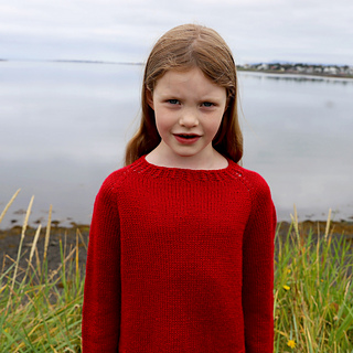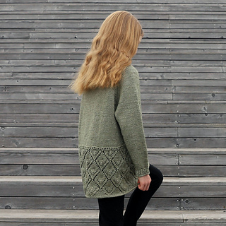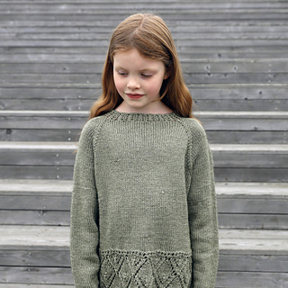 Lotta is knitted top-down, in the round using stockinette stitch and lace pattern at the bottom of the body, on the front of the sleeves, and in the neckline. The yoke shaping is done using raglan increases.