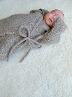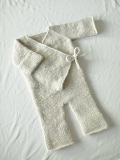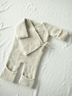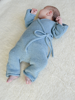 Klaffene gjør slik at denne dressen er veldig god å bruke til barnets hvil for å holde hender og føtter varme. Dressen har en fin og romslig passform som også passer godt til lek. Den strikkes ovenfra og ned i glattstrikk, frem og tilbake på rundpinne, med økninger for å forme forstykkene som skal overlappe hverandre. Til slutt strikkes det i-cord langs kantene og til snor for å knyte i siden. En deilig og god dress til både små babyer og større småbarn.
