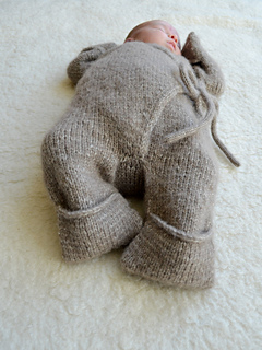 The suit has a nice and roomy fit. It is knit from the top to the bottom in stockinette stitch, back and forth on circular needles, with increases to shape the overlapping front pieces. At the end you cast off in i-cord and make i-cords to fasten at the side of the suit. This is a cozy and warm suit for both little babies and toddlers.