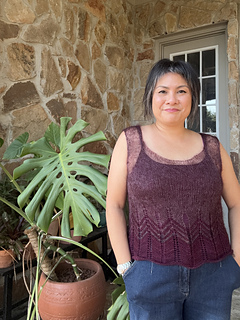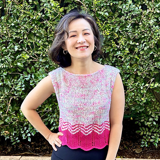 ノースリーブのトップスに甘さを添え, 幸せな気分になれるふんわりとしたトッピングとして着て, その肩をそっと柔らかく包む心地良さを感じて下さい. ボトムアップ式に裾から輪で編み, 中細糸で編むノスタルジックなシェブロンレース模様が波形のヘムラインを作り出します. 続きは控えめに, 極細のシルクモヘア糸一本取りで編み, 肩に向かうにつれ針のサイズを徐々に上げながら編むことで, 透け感と軽さがすばらしいグラデーションになった編地が生まれます. 上に向かうにつれ編む目数が減るので, 予想よりも早く編み終わり, 試着するのが待ちきれない方にはピッタリでしょう. でもその前に, とじ針要らずな, かぎ針1本だけを使うロシア式引き抜きはぎで肩を合わせ, 左右の袖ぐりを輪で2段ずつ編みます. それだけでおしまいです!ロシア式引き抜きはぎは, 細く扱いづらいシルクモヘアのような糸でも最適な手加減ではぎ合せることができ, 編地が攣れることなく, 肩にプルを支える接ぎ目を与えます.