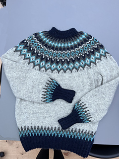 The sweater is knitted in the round from the buttom up. Short rows are worked on the back of the sweater to bring the front of the collar lower then the back. The stranded yoke is worked from chart. Slight waist shaping on the body. All ribs are knitted with 2 ply yarn.