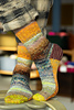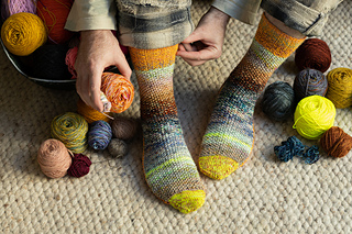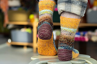 These colorful socks are great stashbusters! Hold two strands of fingering weight sock yarn together to create a melting marled fabric. The squishy seed stitch beautifully blends hand dyed colors together. Dive into your leftover bits of speckled, variegated, and semi-solid yarns. These socks will be finished in a flash with the seamless top-down construction and thick gauge. Have fun creating your own unique marled color story!