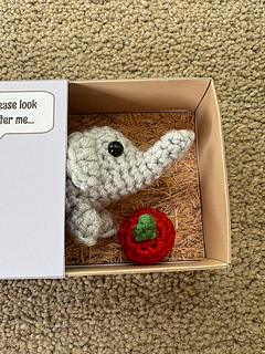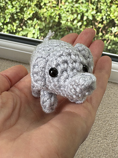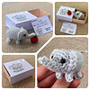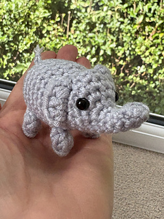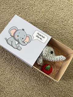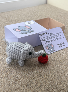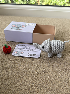 Yarn of your choice. I used dk weight yarn (equivalent to light worsted, weight 3) and my finished elephant measures approximately 8cm long and 5cm tall. Using a thicker yarn than this may result in your pet elephant not fitting inside the accompanying box.