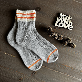 Für ein Paar bis Größe 38/39 werden 58 g in Grau meliert sowie 10 g in Weiß und 3-4 g in Orange benötigt.